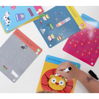 Zadaniem dziecka będzie m.in. rozróżnianie liter wśród innych symboli, łączenie pierwszej litery ze słowem, odnajdywanie wyrazów w wykreślankach czy rysowanie po śladzie. Atutem pakietu są zmywalne strony i flamaster suchościeralny, dzięki któremu zadania można wykonywać wielokrotnie, a do wspólnej zabawy zaangażować rodzeństwo i rówieśników.