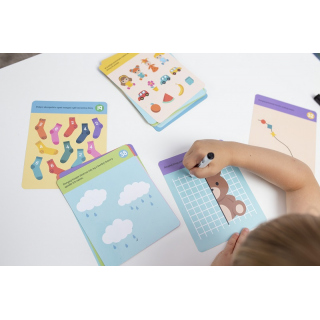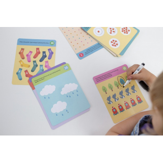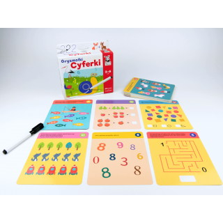 W pakiecie znajdują się m.in. zadania z pisania cyfr po śladzie, liczenia przedmiotów, porównywania obiektów, rozpoznawania figur geometrycznych czy zabawa z odbiciami lustrzanymi.
