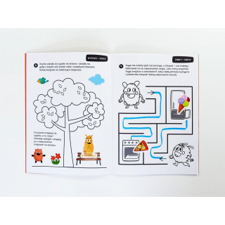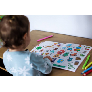 W książeczce znajduje się mnóstwo różnorodnych zadań, dostosowanych do możliwości dwu- i trzylatków. Wszystkie elementy do kolorowania mają gruby obrys, a kolorowe naklejki są odpowiednio duże, by łatwo je było odkleić i umieścić w odpowiednim miejscu na ilustracji.