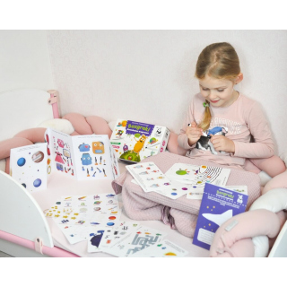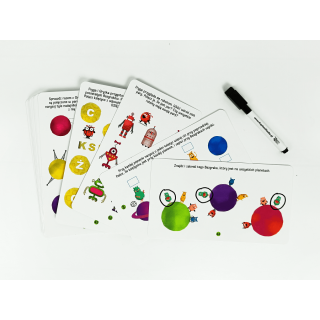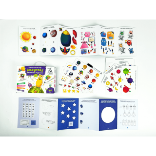 W poręcznej walizeczce znajdują się karty z mazakiem suchościeralnym, długa książeczka z różnorodnymi ćwiczeniami, 80 kolorowych naklejek do zadań i czytania sylabami, a także materiały do wycinania oraz tworzenia pojazdów kosmicznych, robotów i modelu Układu Słonecznego.