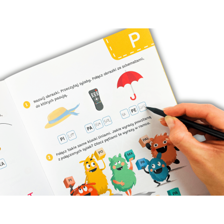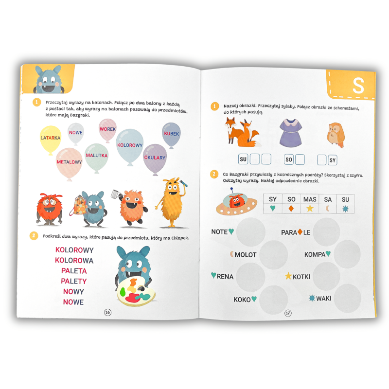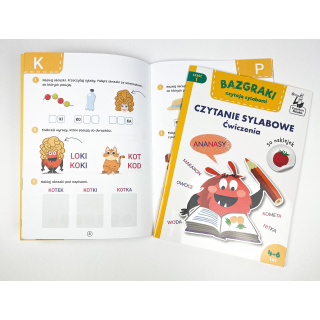 Bazgraki czytają sylabami to zeszyt z pomysłowymi zabawami dla dzieci, które rozpoczynają przygodę z czytaniem. Dzięki metodzie sylabowej będą doskonalić umiejętności stopniowo: poznają samogłoski, nauczą się je wyodrębniać, z czasem poznają spółgłoski, by potem płynnie czytać proste wyrazy i zdania.