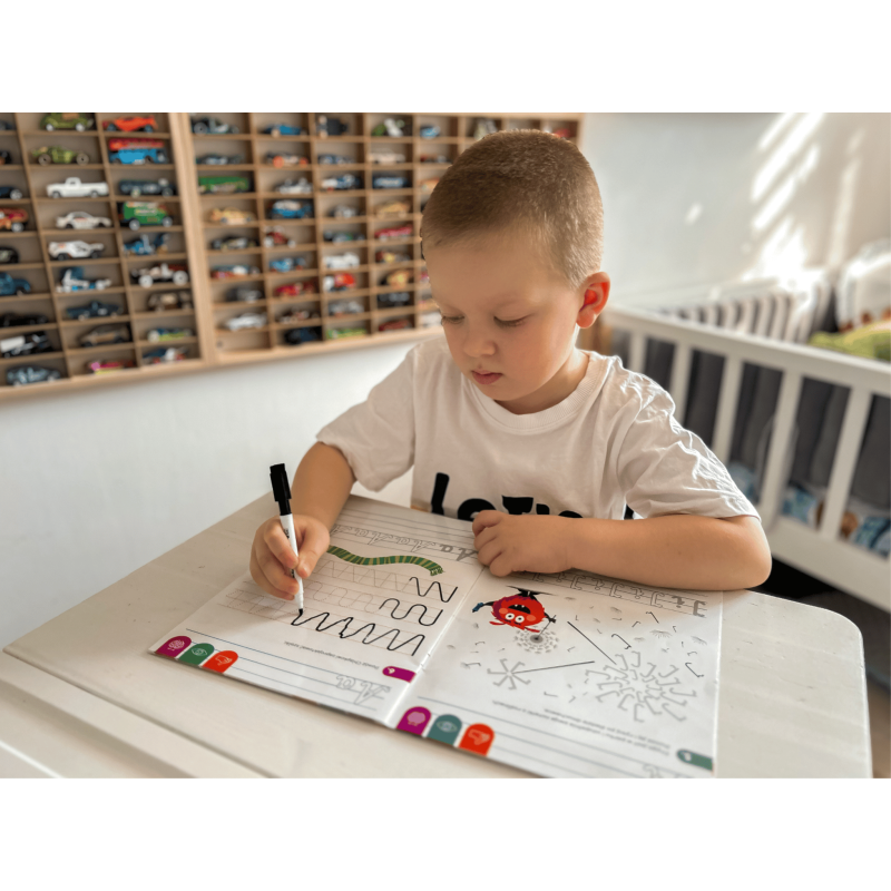 W książce znajduje się mnóstwo atrakcyjnych łamigłówek, które ćwiczą rękę w rysowaniu prostych szlaczków i ułatwiają zapamiętanie oraz pisanie liter alfabetu. Dołączony pisak ścieralny pozwala na wielokrotne poprawki, a duży format A4 ułatwia rysowanie.