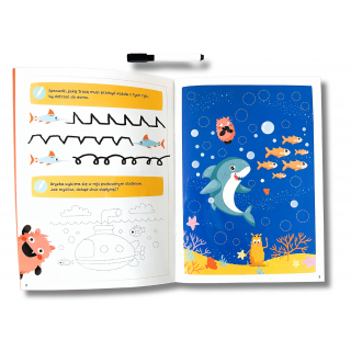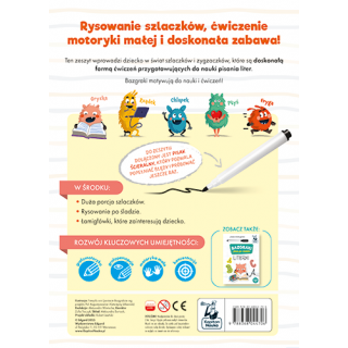Szlaczki są doskonałą formą doskonalenia motoryki małej i przygotowują do nauki pisania literek. Zadania są przeplecione ciekawymi łamigłówkami, które dadzą maluchowi mnóstwo frajdy. Do zeszytu dołączony jest pisak ścieralny – w zestawieniu z odpowiednio przygotowanymi zadaniami pozwoli dziecku popełniać błędy i próbować jeszcze raz.
