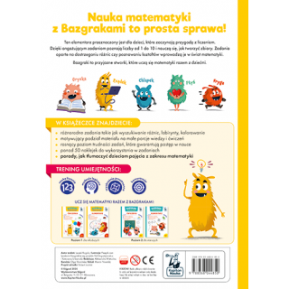 Bazgraki poznają matematykę. Elementarz. Poziom 1 to książeczka z różnorodnymi aktywnościami matematycznymi dla dzieci w wieku 3-4 lata. W przyjemny i skuteczny sposób wprowadza najmłodszych do świata matematyki, zaznajamiając m.in. z takimi zagadnieniami, jak pojęcie „taki sam”, położenie i relacje przestrzenne, liczenie i wykonywanie działań w zakresie od 0 do 10, odnajdywanie różnic czy kształty oraz figury geometryczne.