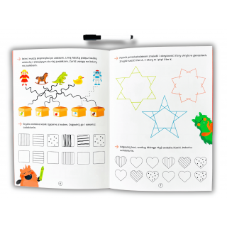 Książeczka zawiera różnorodne zadania pomagające kształcić koordynację oko-ręka, spostrzeganie wzrokowe czy grafopercepcję. Przedszkolaki będą tutaj rysować po śladzie, uzupełniać wzory i rytmy, szeregować obiekty, odwzorowywać kształty i wiele, wiele innych!