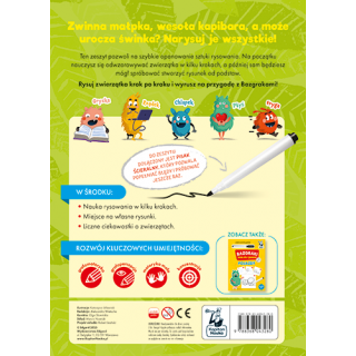 Bazgraki uczą się rysować. Zwierzęta to barwna książeczka wprowadzająca dzieci w podstawy rysowania. Bohaterami są urokliwe, nieodmiennie fascynujące dla dzieci zwierzątka m.in. pingwinek, kot, lew, kapibara, kangurzyca, świnka i wiele innych!