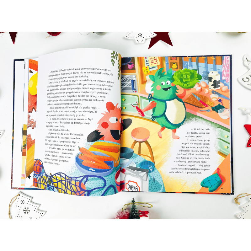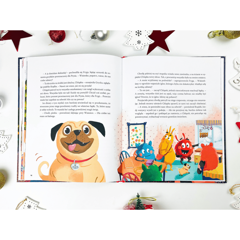 Dzieci odkryją m.in, jak Fryga przypadkiem znajduje merdającą kuleczkę w samym środku przedświątecznych przygotowań, dlaczego Chlapek gubi się w pogoni za idealnymi prezentami i jak naukowe eksperymenty Gryzki mogą niespodziewanie pomóc w pieczeniu świątecznego sernika. Ta świąteczna książeczka dla dzieci: wprowadza w ciepłą, rodzinną atmosferę Bożego Narodzenia, uczy empatii, przyjaźni i współpracy, rozwija kompetencje emocjonalno-społeczne oraz pozwala dzieciom lepiej zrozumieć własne emocje i relacje z innymi.