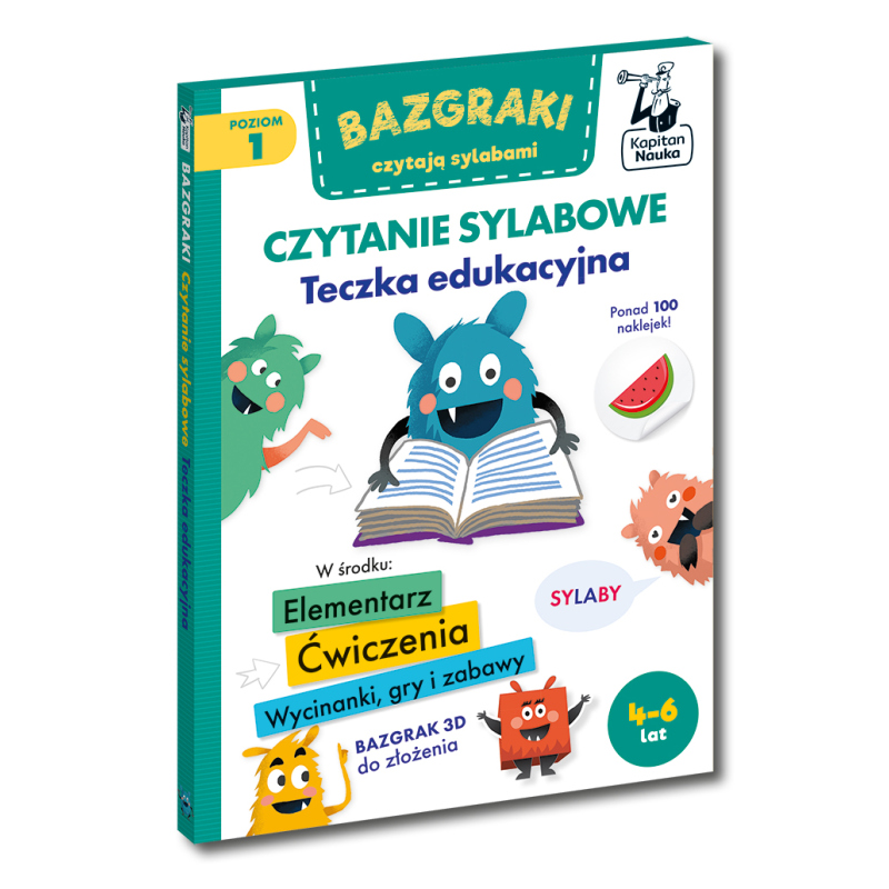 Uzupełnieniem jest 12 kart z angażującymi grami sylabowymi, składany Bazgrak 3D, a także ponad 100 naklejek, które zamienią naukę czytania w kreatywną zabawę i skutecznie pomogą utrwalić zdobyte umiejętności.