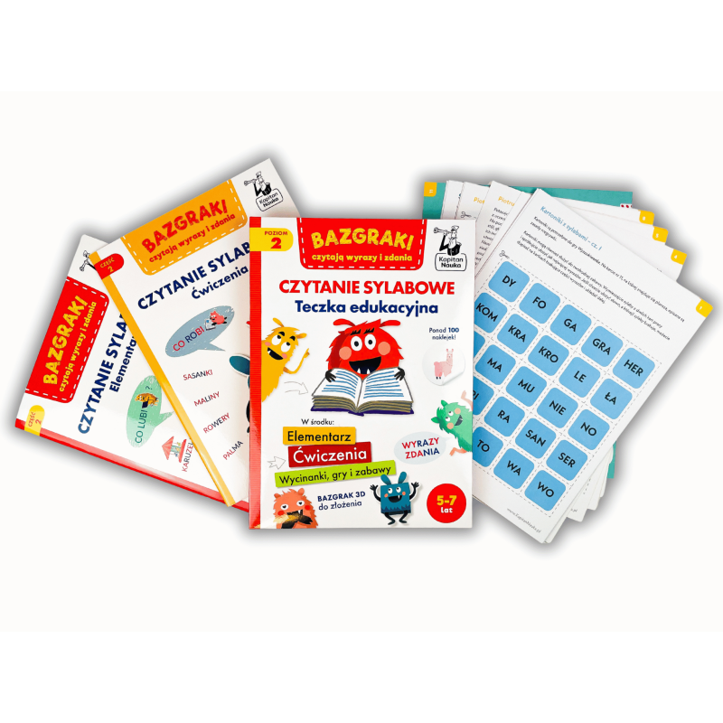 Bazgraki czytają wyrazy i zdania. Czytanie sylabowe. Teczka edukacyjna to idealna propozycja dla dzieci w wieku 5–7 lat, które znają już litery i zaczynają swoją prawdziwą przygodę z czytaniem. Ten kompletny zestaw edukacyjny skutecznie wspiera naukę czytania metodą sylabową, rozwijając płynność, pewność siebie i radość z samodzielnego odkrywania słów.