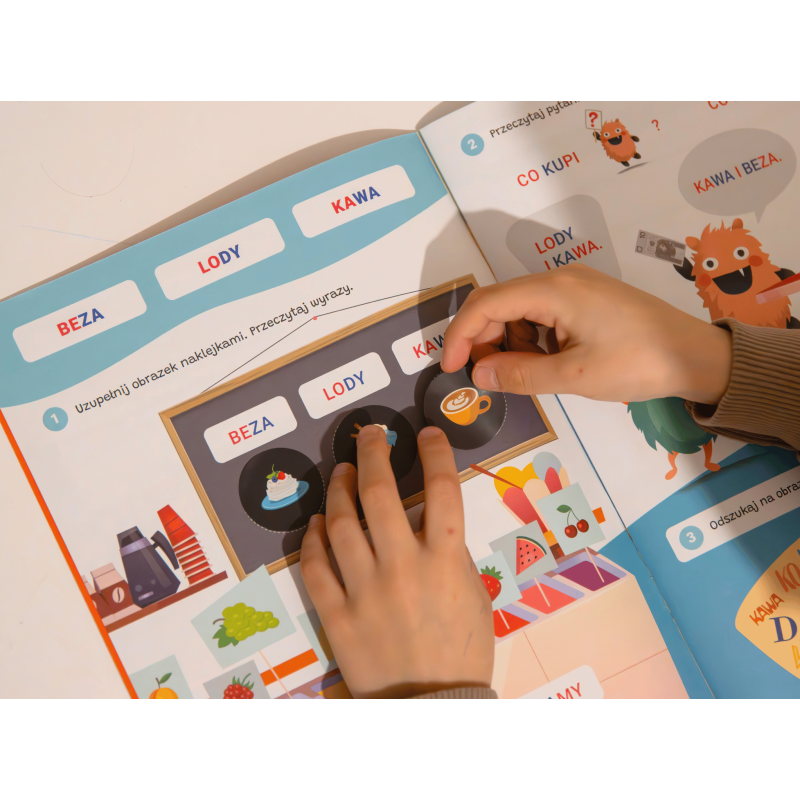 W teczce znajduje się także ponad 100 naklejek, które wzmacniają motywację dziecka i zachęcają do samodzielnej pracy. Metoda sylabowa zastosowana w zestawie pomaga szybciej opanować czytanie, buduje poczucie sukcesu i sprawia, że dziecko chętnie sięga po kolejne zadania.