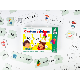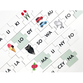 Uzupełnieniem zabaw w książeczce są dołączone do zestawu dwustronne puzzle z barwnymi obrazkami i sylabami. Z puzzli można układać łatwiejsze dwu- i trzysylabowe wyrazy z sylabami otwartymi, takie jak: foka czy papuga, oraz trudniejsze wyrazy, zawierające więcej spółgłosek, np. koniczyna, długopisy.