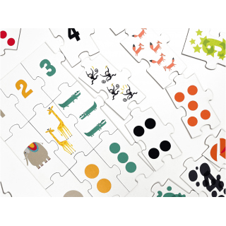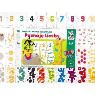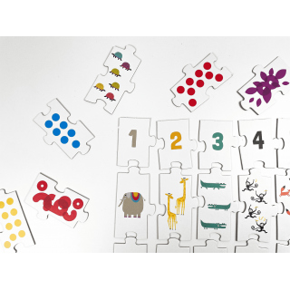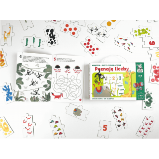 Uzupełnieniem zabaw w książeczce są dołączone do zestawu puzzle z liczbami, kropkami i zwierzakami. Puzzle można układać na różne sposoby, dbając tylko o to, by łączyć je zgodnie z policzonymi elementami, np. łączyć je w pionie lub poziomie albo zamieniać miejscami kolejne rzędy ze zwierzakami lub kropkami.