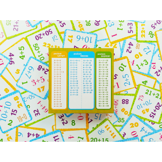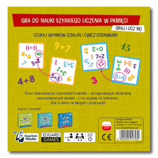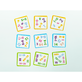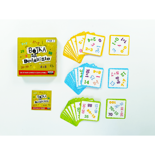 Na kartach do gry znajdują się działania dodawania oraz sumy przedstawione za pomocą kolorowych zapisów działań i wyników, tak aby zaangażować uwagę najmłodszych graczy na dłużej.