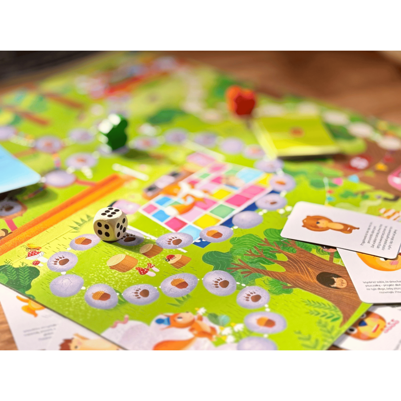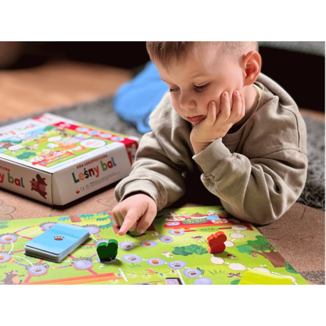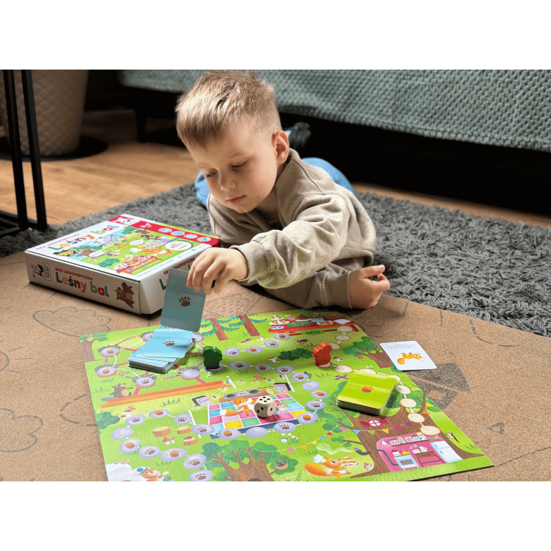 Leśny bal to logopedyczno-ruchowa gra planszowa, która zaangażuje przedszkolaków do aktywności, nie tylko buzi i języka, ale całego ciała. Różnorodne zadania zagwarantują wsparcie całościowego rozwoju dziecka: intelektualnego, społecznego, emocjonalnego, ruchowego oraz rozwoju mowy. Najmłodsi opanują poprawną wymowę głosek oraz poćwiczą równowagę, kontrolę i planowanie ruchów, a także udoskonalą umiejętność współpracy. W grze nie ma rywalizacji, wszyscy grają w jednej drużynie, co pozwala skupić się na wykonywaniu zadań i realizacji celów edukacyjnych. Gra sprawdzi się również podczas zabawy w pojedynkę!