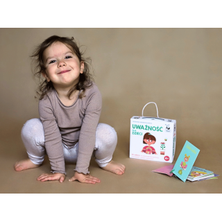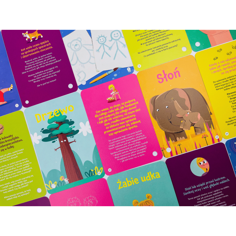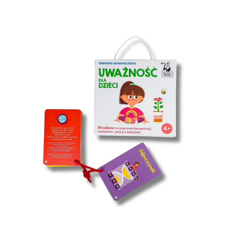 Uważność dla dzieci. Trening mindfulness to zestaw 50 pięknie ilustrowanych, dwustronnych kart przeznaczonych do treningu uważności. Są narzędziem do rozwijania swojego kontaktu z chwilą obecną oraz pełnego i akceptującego zwracania uwagi na to, co dzieje się tu i teraz. Powstały z myślą o dzieciach od 4. roku życia, ale z doświadczenia wiemy, że podobają się niezależnie od wieku. Zawierają różne typy ćwiczeń, które pomagają pielęgnować wewnętrzny spokój, wyciszenie i koncentrację: zabawy ruchowe, ćwiczenia oddechowe, zabawy relaksacyjne, wizualizacje, aktywności plastyczne. Doskonale sprawdzą się w domu, przedszkolu, szkole, gabinecie psychologicznym.