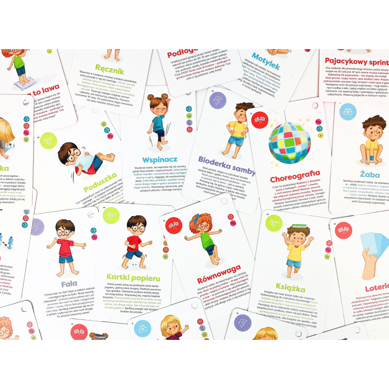 Ruch to kluczowy element rozwoju dziecka – wspiera koordynację, równowagę, świadomość ciała i pewność siebie. Ta gra zachęca do aktywności fizycznej i daje dużo radości. Każda karta to okazja do ćwiczeń, które bawią, rozwijają i wzmacniają ciało. Wspólna zabawa to najlepszy sposób na budowanie zdrowych nawyków!