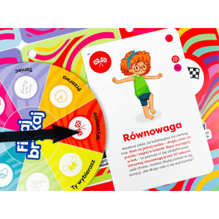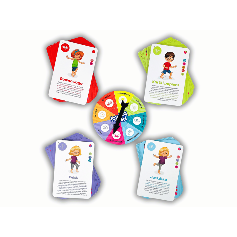 W pudełku aż 50 pięknie ilustrowanych kart z ćwiczeniami. Kolorowe koło losujące wprowadza element niespodzianki i emocji, dzięki czemu każda rozgrywka wygląda inaczej! Możesz grać w pojedynkę, z przyjaciółmi lub całą rodziną – w duchu rywalizacji lub współpracy.