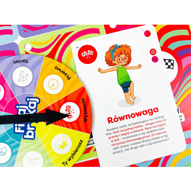 Fikaj, brykaj! to pełna energii i śmiechu gra ruchowa dla dzieci od 4 lat, która rozrusza całą rodzinę! Skacz jak żabka, fruń jak jaskółka, zatańcz twista i przekonaj się, jak dużo radości daje wspólna aktywność. Każde losowanie to nowe zadanie i nowa dawka ruchu. Ta wyjątkowa zachęca do aktywności fizycznej w domu i przedszkolu, rozwija koordynację ruchową, równowagę, gibkość i poczucie rytmu, a przy okazji – wzmacnia więzi i uczy współpracy.