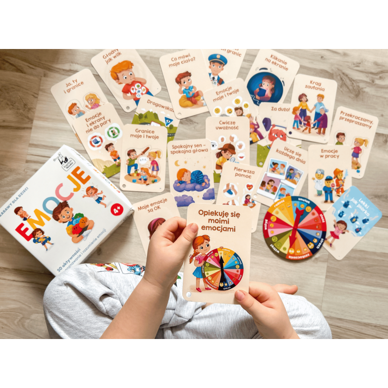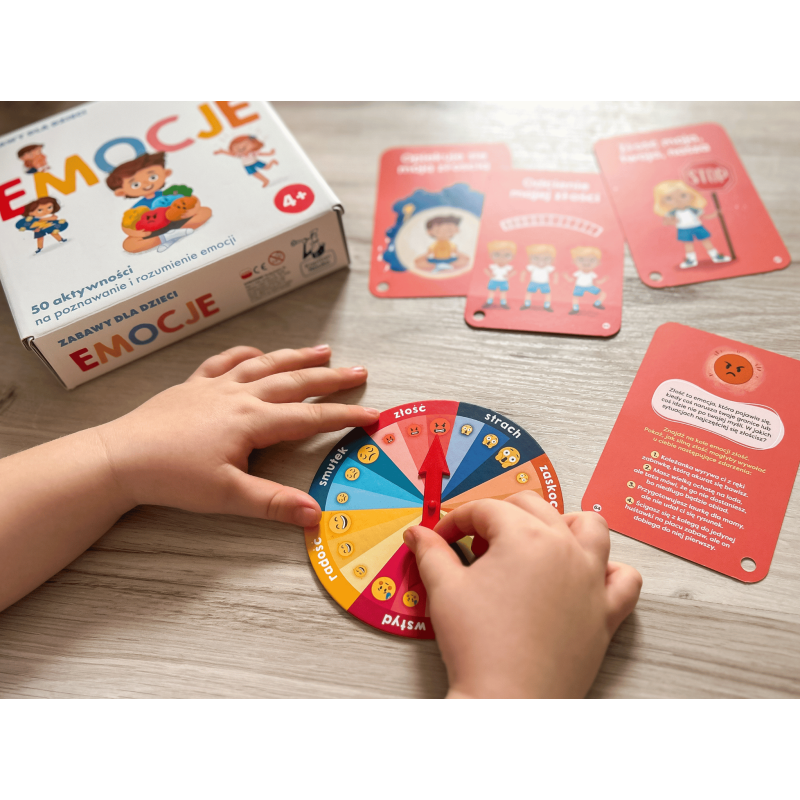 Każda aktywność została zaprojektowana tak, aby angażować dziecko poprzez zabawę, rozmowę i refleksję. Piękne ilustracje oraz przystępny język zachęcają do wspólnego spędzania czasu i otwierają przestrzeń do rodzinnych rozmów o emocjach. Zestaw został opracowany przez psycholożkę dziecięcą, dzięki czemu stanowi realne wsparcie w nauce empatii, uważności na siebie i innych oraz radzenia sobie z trudnymi emocjami. Koło emocji, dzięki barwnej prezentacji podstawowych uczuć, pomaga dzieciom nazwać to, co przeżywają, nawet wtedy, gdy brakuje im jeszcze słów.