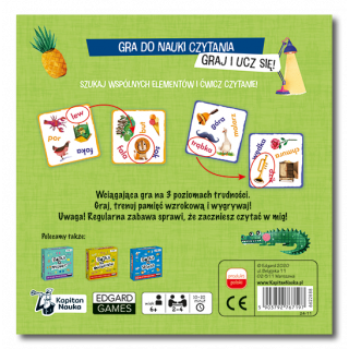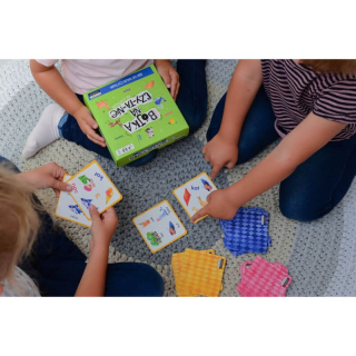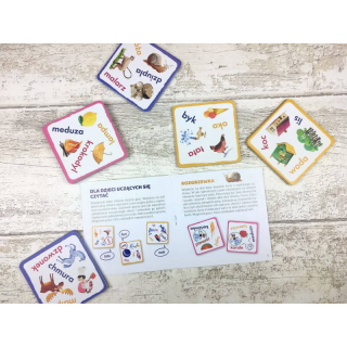 Na kartach do gry ilustrowanych przez Joannę Gwis, pojawiły się kolorowe przedmioty znane z życia codziennego, zwierzęta oraz odpowiadające im nazwy. Barwne grafiki dodają rozgrywkom atrakcyjności, przyciągają uwagę dziecka i skupiają jego wzrok podczas gry. W zestawie są również dodatkowe karty z minisłowniczkiem obrazkowym, idealnym dla sprawdzenia wiedzy i powtórek.