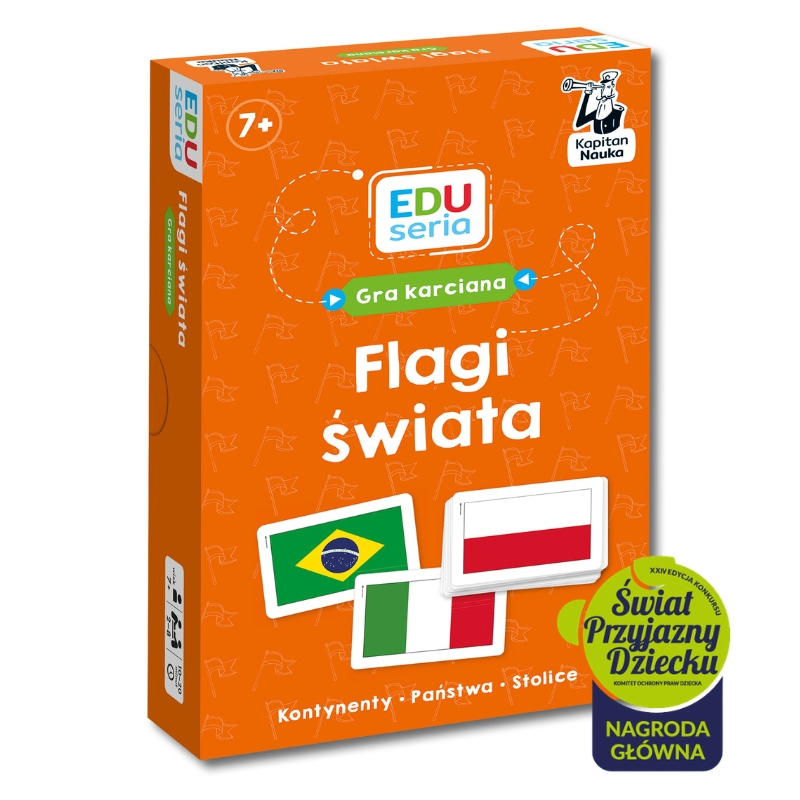 EDUseria. Flagi świata. Gra karciana to wyjątkowa rozrywka połączona z wycieczką dookoła świata. Poręczne pudełko zawiera 55 kart do gry o prostej mechanice. Pozwala w przyjemny i łatwy sposób zdobyć podstawową wiedzę z zakresu geografii, czyli opanować położenie kontynentów i krajów na mapie świata, nauczyć się nazw stolic poszczególnych państw oraz zapamiętać wygląd ich flag!