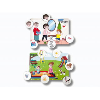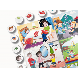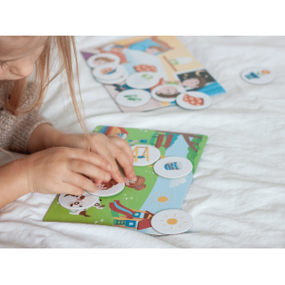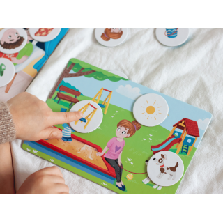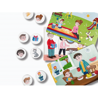 Gra zawiera barwne plansze, na których znajdziecie ilustracje przedstawiające małego Stasia podczas ważnych codziennych czynności: zabawy w piaskownicy, smacznego posiłku, spaceru, wieczornej kąpieli czy słuchania czytanki na dobranoc. Razem z maluchem możecie obserwować najbliższe otoczenie Stasia, wskazywać palcem przedmioty, układać żetony w różne sekwencje, naśladować dźwięki, odgrywać scenki z życia codziennego, wymyślać historyjki, szukać nowych słów na nazwanie przedmiotów i czynności czy zadawać sobie nawzajem mnóstwo pytań i zagadek! W ten sposób malec nabierze ochoty do opowiadania i poczuje radość ze wspólnych rozmów! To także przyjemny trening takich kluczowych umiejętności dziecka, jak: poznawanie świata, spostrzegawczość, koordynacja oko-ręka, rozwój mowy.
