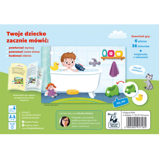 Moja pierwsza gra. Już mówię to stworzone przez ekspertkę zabawy wspierające rozwój mowy u dzieci od 18. miesiąca życia. W pudełku mieści się 6 prostokątnych plansz, 36 okrągłych żetonów oraz książeczka z pomysłami na zabawy i wskazówkami dla rodzica. Dzięki grze dziecko kształci umiejętność mówienia poprzez powtarzanie wyrazów, poznawanie nowych słów oraz budowanie zdań.