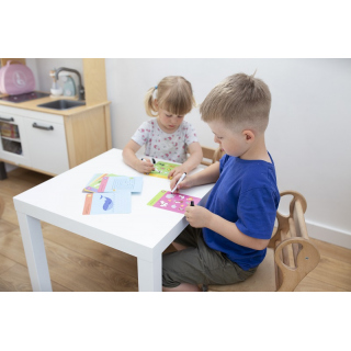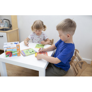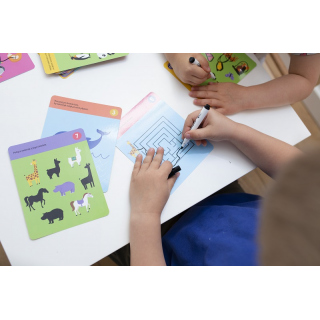 W zestawie aż 60 zagadek opracowanych przez ekspertki i nauczycielki edukacji wczesnoszkolnej. Podczas rozwiązywania zadań, dziecko pozna wiele ciekawostek o zwierzętach i przyrodzie, a także poćwiczy umiejętność myślenia logicznego, liczenia i pisania. Dodatkowym atutem jest możliwość wielokrotnego uzupełniania i zmazywania kart dzięki suchościeralnemu flamastrowi. To ułatwienie przy wspólnej zabawie z rodzeństwem i rówieśnikami.