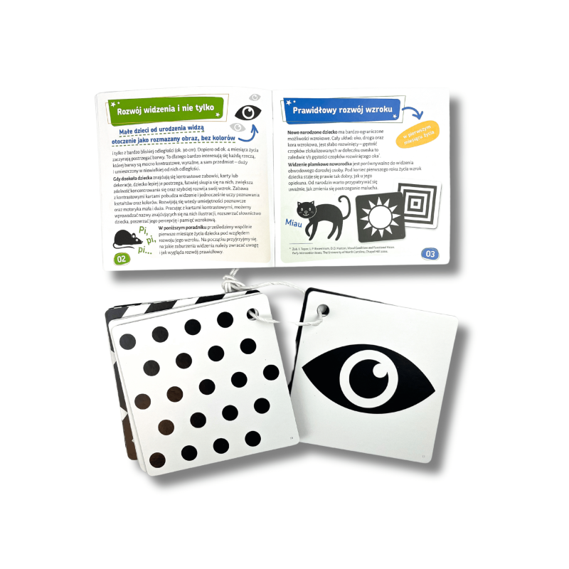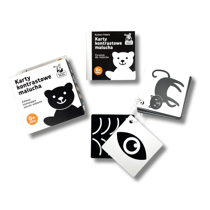 Pierwszy zestaw z serii kontrastowej zawiera 10 dwustronnych czarno-białych kart oraz poradnik dla opiekunów ze wskazówkami terapeutki widzenia i optometrystki Barbary Pakuły.