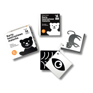 Karty kontrastowe malucha 0+ mies. to zestaw zabaw stymulujących wzrok najmłodszych dzieci, które tuż po urodzeniu widzą otoczenie jako rozmazany obraz bez kolorów. Czarno-białe karty kontrastowe ułatwiają maluchowi wyodrębnianie konkretnych kształtów, a przy tym stwarzają okazję do budowania bliskości podczas pierwszych wspólnych zabaw.