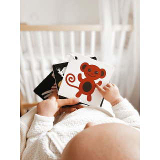 Karty kontrastowe dla niemowląt mogą służyć jako wsparcie w ćwiczeniu wzroku malucha, nauce kolorów i kształtów, a także nazywaniu obiektów i naśladowaniu np. odgłosów stworzeń i przedmiotów przedstawionych na rysunkach.