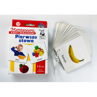 Na każdej karcie umieszczono realistyczne ilustracje z podpisami. Wśród 34 obrazków można znaleźć m.in. zabawki, ubrania, warzywa, owoce, a także aktywności, takie jak: jedzenie, spanie czy mycie się. Zabawa z kartami obrazkowymi poszerza zasób słownictwa maluszka i zachęca do odkrywania świata pełnego kolorów i kształtów, rozwijając myślenie i ciekawość u dziecka.