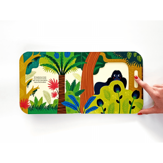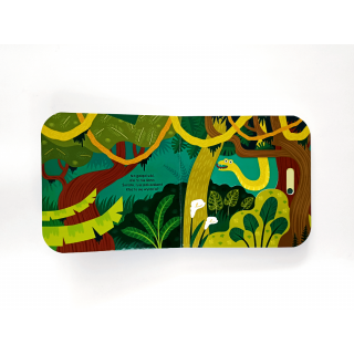 Kto mieszka w dżungli? to książeczka z serii Dotknij i przesuń, dzięki której maluchy zaobserwują zmiany w dzikiej dżungli. Za jednym ruchem paluszka odkryją, kto ukrył się w liściach lub wśród egzotycznych kwiatów.