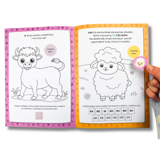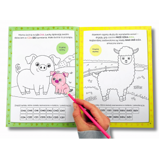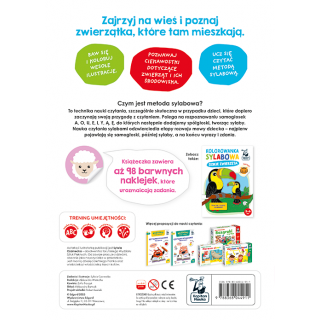 Kolorowanka sylabowa. Na wsi to książeczka-kolorowanka dla dzieci w wieku od 3 do 6 lat. Jej bohaterami są zwierzątka, które dziecko może spotkać na wsi – kaczka, piesek, indyk, owca, kura, krowa i wiele innych! Dzieci kolorują obrazki, poznają wspaniałe ciekawostki o mieszkańcach wsi oraz uczą się czytać metodą sylabową. Zabawę z kolorowanką uatrakcyjnia pakiet aż 98 kolorowych naklejek.