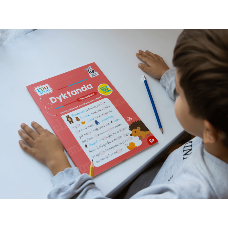 EDUseria. Dyktanda. Ćwiczenia to zeszyt pełen angażujących zadań dla dzieci od 6. roku życia pozwalający trenować znajomość polskiej ortografii. To nie tylko dyktanda, lecz także krzyżówki, łamigłówki, rozsypanki, szyfry, zabawy z naklejaniem i uzupełnianiem luk w tekście. Na dzieci czekają nie tylko ciekawe typy zadań, lecz także moc kolorowych obrazków i sympatycznych bohaterów!