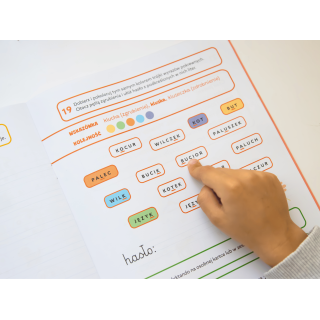 W zestawie znajduje się niemal 100 naklejek, które uatrakcyjniają zabawę i ułatwiają zapamiętywanie ortograficznych niuansów. Na okładce książeczki mieszczą się najważniejsze zasady pisowni wymienione w przejrzystych punktach oraz instrukcja, jak korzystać z książki.