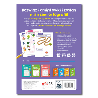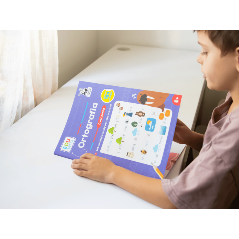 EDUseria. Ortografia. Ćwiczenia to książeczka pełna urozmaiconych zadań wspierających naukę ortografii dla dzieci od 6. roku życia. Zeszycik charakteryzuje się bogatą szatą graficzną i różnorodnością prezentowanych ćwiczeń. Znajdują się tu barwnie ilustrowane rebusy, krzyżówki, zadania z lukami, szyfry i wiele innych!