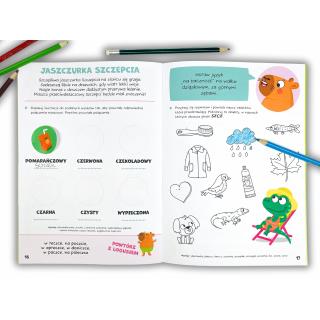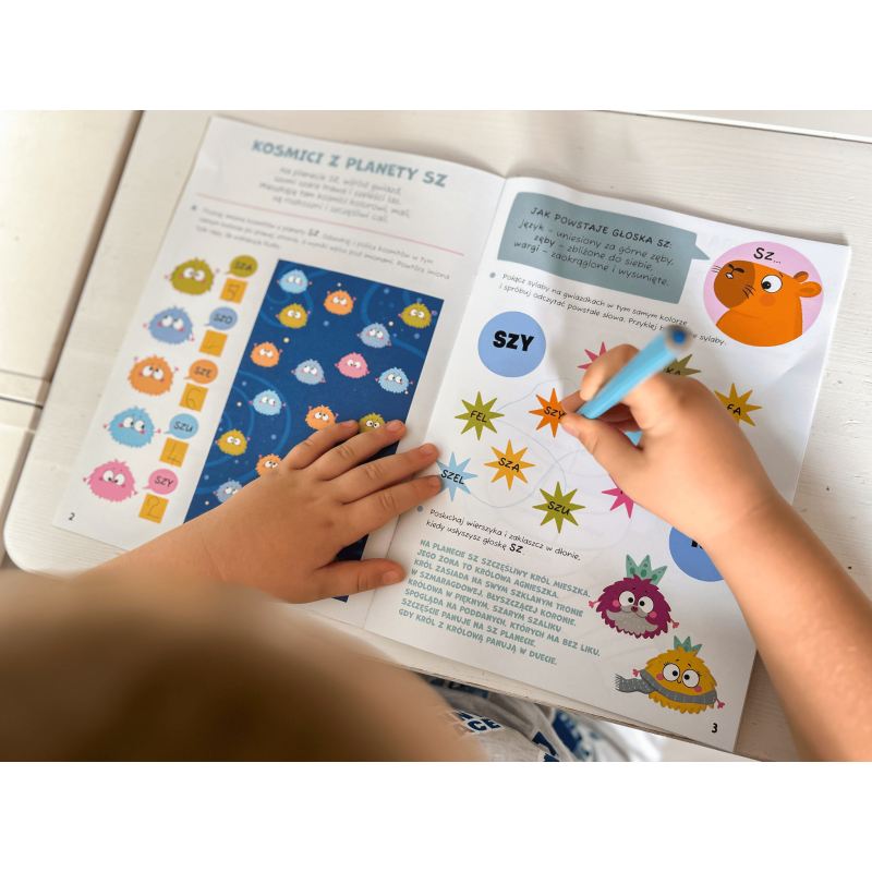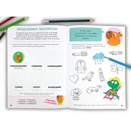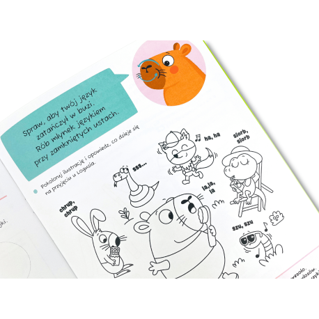 Książeczka skutecznie wspiera rozwój prawidłowej wymowy u dzieci oferując im nie tylko starannie opracowany przez logopedkę materiał, lecz także – pokaźną porcję zabawy! Na najmłodszych czekają tutaj kolorowe rozkładówki pełne ilustracji, zadań z rysowaniem, naklejaniem, zliczaniem, łączeniem w pary i wiele innych. O miłą atmosferę podczas zabawy dba Kapibara Loguś i jego kompania!