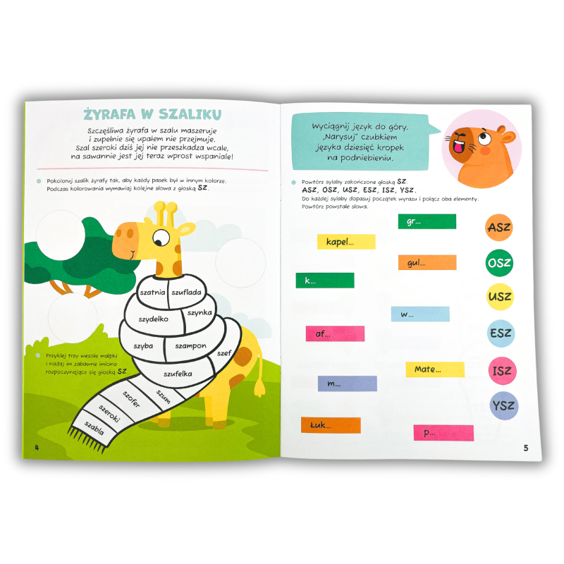Zabawy logopedyczne. Kapibara Loguś. Ćwiczę łamańce to barwnie ilustrowana, pełna urozmaiconych i zabawnych treści książeczka z ćwiczeniami logopedycznymi dla 5-latków. Poszczególne zadania, opracowane przez specjalistkę, wspierają dzieci w poprawnej wymowie głosek szeregu szeleszczącego: SZ, Ż, CZ, DŻ.