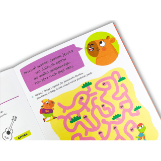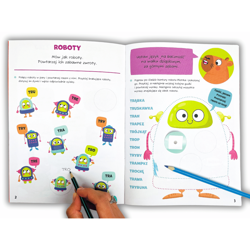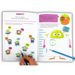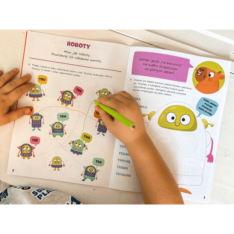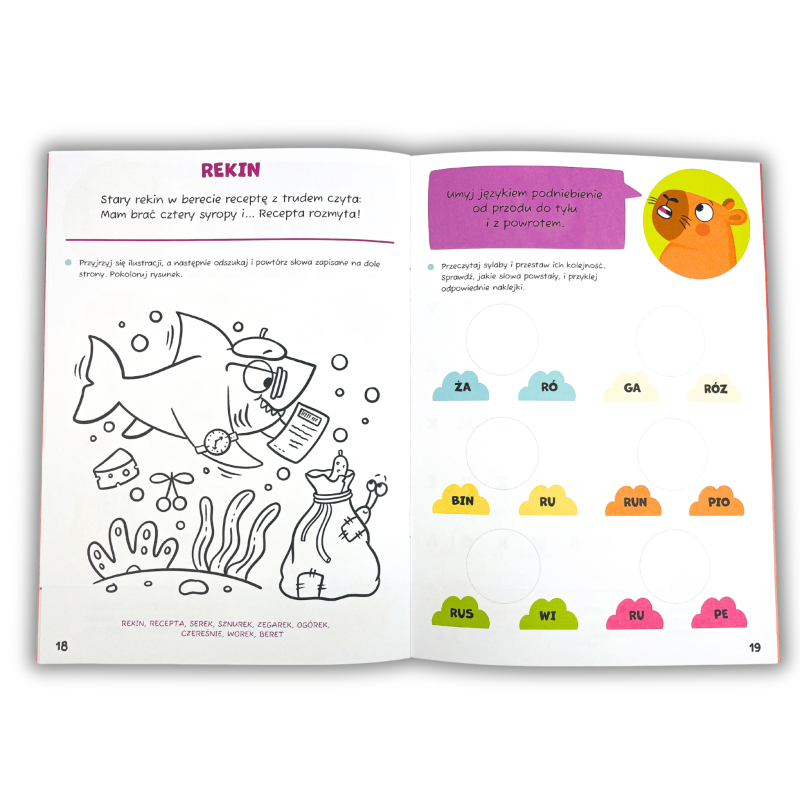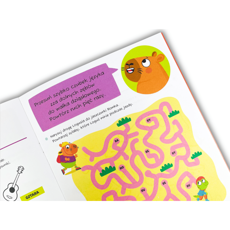 Książeczka zachęca dzieci do ćwiczeń logopedycznych i trenowania poprawnej wymowy głoski „r” w formie ciekawych, aktywizujących zabaw. Dzieci mają tu okazję rysować, przyklejać naklejki, kolorować, tworzyć szlaczki, stroić miny, naśladować odgłosy, nadymać buzię i wiele, wiele innych! Kapibara Loguś i jego załoga zadbają o uśmiechy na dziecięcych buziach!