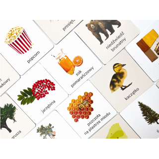 Montessori wierzyła, że dzieci lubią być blisko natury, która je otacza. Dlatego zachęcajmy je do spotkań z przyrodą, które będą angażować zmysły wzroku, dotyku, słuchu i węchu, oraz do zabaw z pomocami, takimi jak te karty. Przedstawione na nich realistyczne ilustracje stanowią doskonałe uzupełnienie wiedzy o otaczającym świecie.