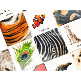 W zestawie znajduje się 35 dwustronnych kolorowych kart z realistycznymi ilustracjami, które pozwalają obserwować cętki, paski, kolory i inne szczegóły wyglądu zwierząt.
