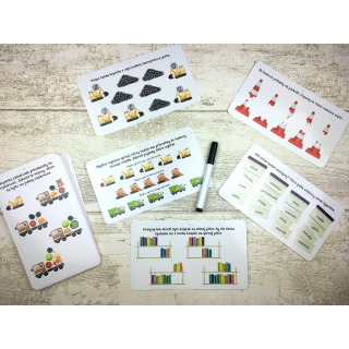 W zestawie książeczka z zadaniami, 30 dwustronnych zmywalnych kart z zadaniami oraz flamaster