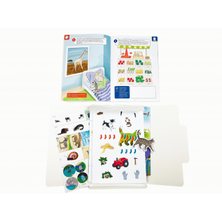 Zebrany w teczce pakiet Montessori oferuje 3-latkom mnóstwo atrakcyjnych dla nich zabaw: naklejanie, wypychanie, rysowanie obwódek grubą kredką, malowanie paluszkami zanurzonymi w farbie, odnajdywanie szczegółów, pokazywanie różnic między obrazkami, łączenie przedmiotów w pary i wiele innych.