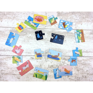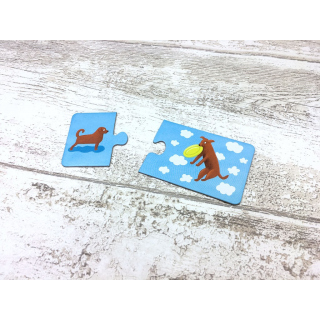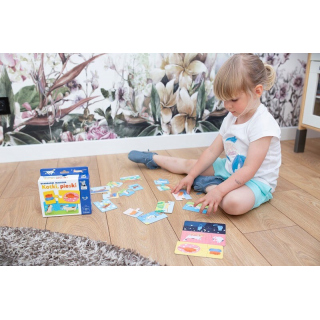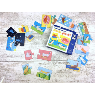 Na 10 dwuelementowych układankach przedstawiono ulubione zwierzęta najmłodszych, koty i psy w codziennych sytuacjach. Dzieci zobaczą ilustracje ze zwierzątkami podczas zabawy, spacerów czy jedzenia.
