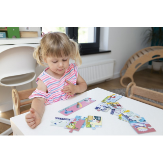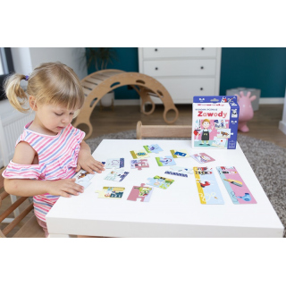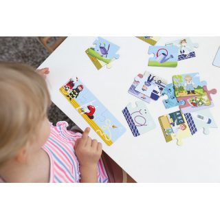 Zadaniem dziecka jest połączenie wszystkich puzzli w trzyelementowe układanki. Podczas zabawy najmłodsi mogą opowiadać o poznanych zawodach i umiejętnościach ich przedstawicieli. To dobra okazja do dyskusji z dzieckiem o tym, kim chciałoby zostać w przyszłości.