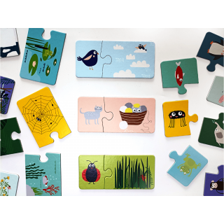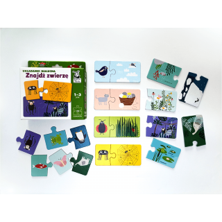 Znajdź zwierzę to zestaw barwnych, dwuelementowych puzzli dla najmłodszych. Zostały one zainspirowane pytaniami maluchów, które uwielbiają odkrywać miejsca zamieszkiwane przez domowe i egzotyczne zwierzęta.