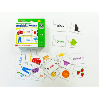 Układanki malucha Angielski. Kolory to pakiet trzyelementowych puzzli, dzięki którym maluchy poznają pierwsze angielskie słówka, takie jak black, red czy blue. Każdy z zestawów składa się z dwóch obrazków z rzeczami w danym kolorze oraz trzeciego z podpisem w języku angielskim. Dziecko dopasowuje kolorowe rysunki do nazwy koloru. Maluch oswaja się z zapisem słówek, a dzięki nagraniom do pobrania (ze strony internetowej) osłuchuje się również z poprawną wymową.