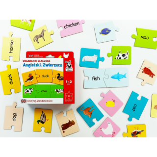 Układanki malucha. Angielski. Zwierzęta to pakiet puzzli, dzięki którym maluchy poznają pierwsze angielskie słówka, takie jak cat, dog czy duck. Każdy z trzyelementowych zestawów składa się z dwóch obrazków zwierząt oraz trzeciego z podpisem w języku angielskim. Dziecko dopasowuje kolorowe rysunki zwierzaka do jego nazwy. Dzięki nagraniom do pobrania (ze strony internetowej) maluch osłuchuje się również z poprawną wymową, a także oswaja z zapisem angielskich słówek.