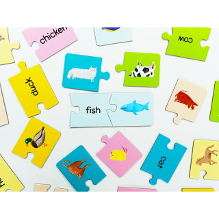 Dzięki angażującej zabawie z puzzlami maluchy poznają angielskie nazwy zwierząt, a przy okazji trenują koordynację oko-ręka, spostrzegawczość i koncentrację.